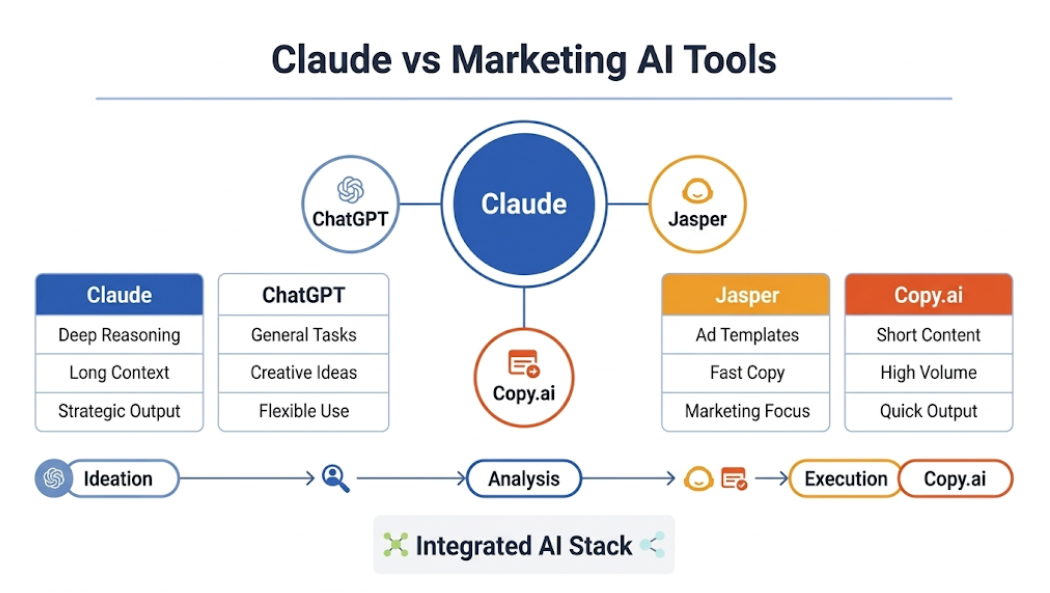 In this article I will walk through exactly how Claude AI fits into the modern marketing stack. I will explain what Claude is, how it compares with other tools like ChatGPT, Jasper, and Copy.ai, and how experienced marketing teams are integrating it into real workflows.
