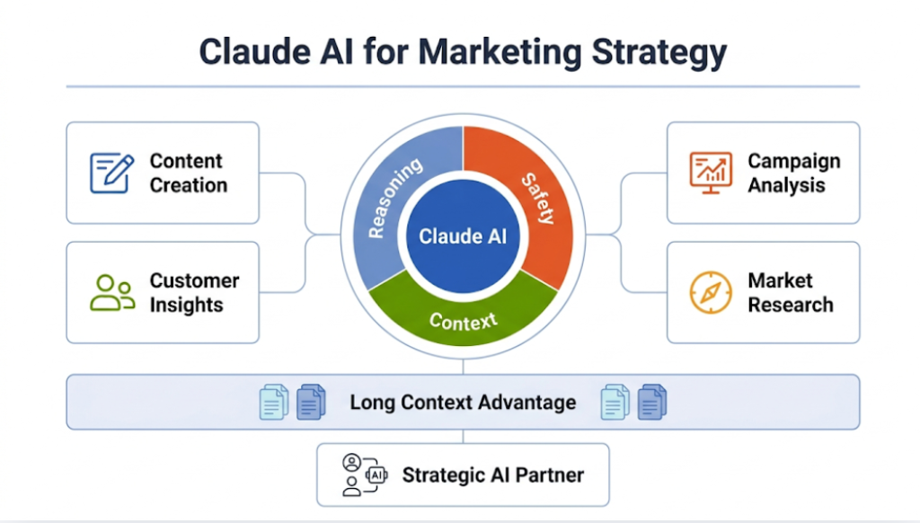 Claude plays its most valuable role when marketers need to synthesize complex information and translate insights into structured messaging.
