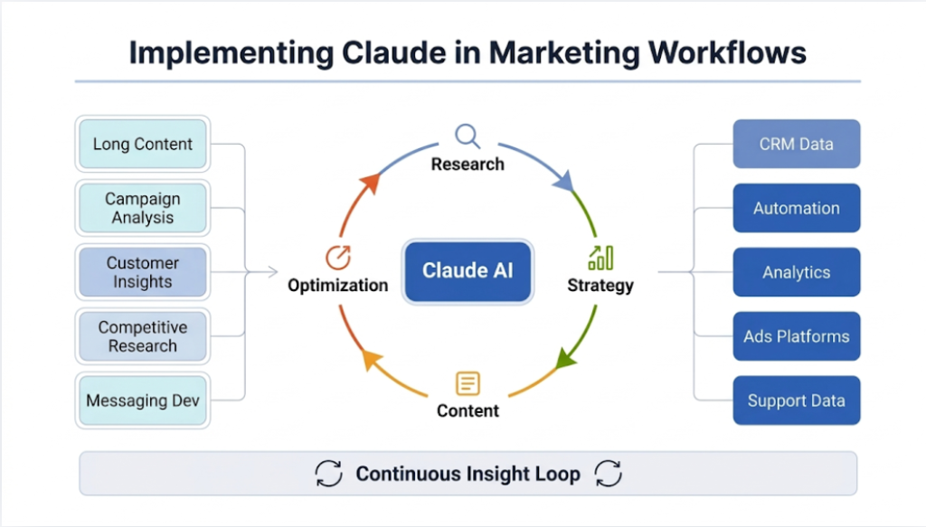 • Claude AI processes large context inputs like brand guidelines, CRM data, and research reports to generate nuanced insights and strategy recommendations.
