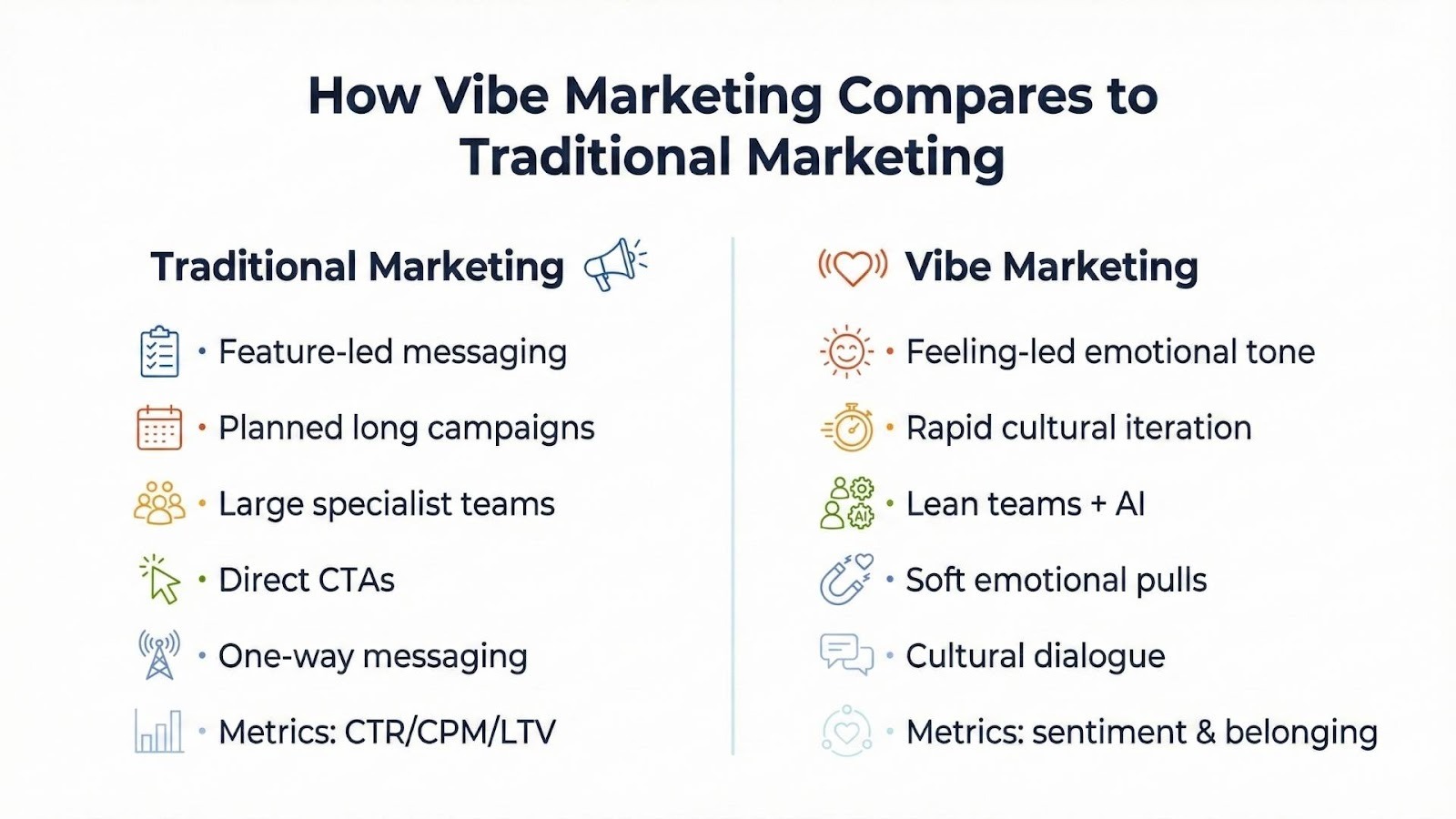 Vibe marketing isn’t just a stylistic trend; it’s a structural divergence from traditional models. And if you’re operating in a hybrid environment where you’re integrating vibe-centric tactics into existing campaigns, this contrast becomes even more critical.