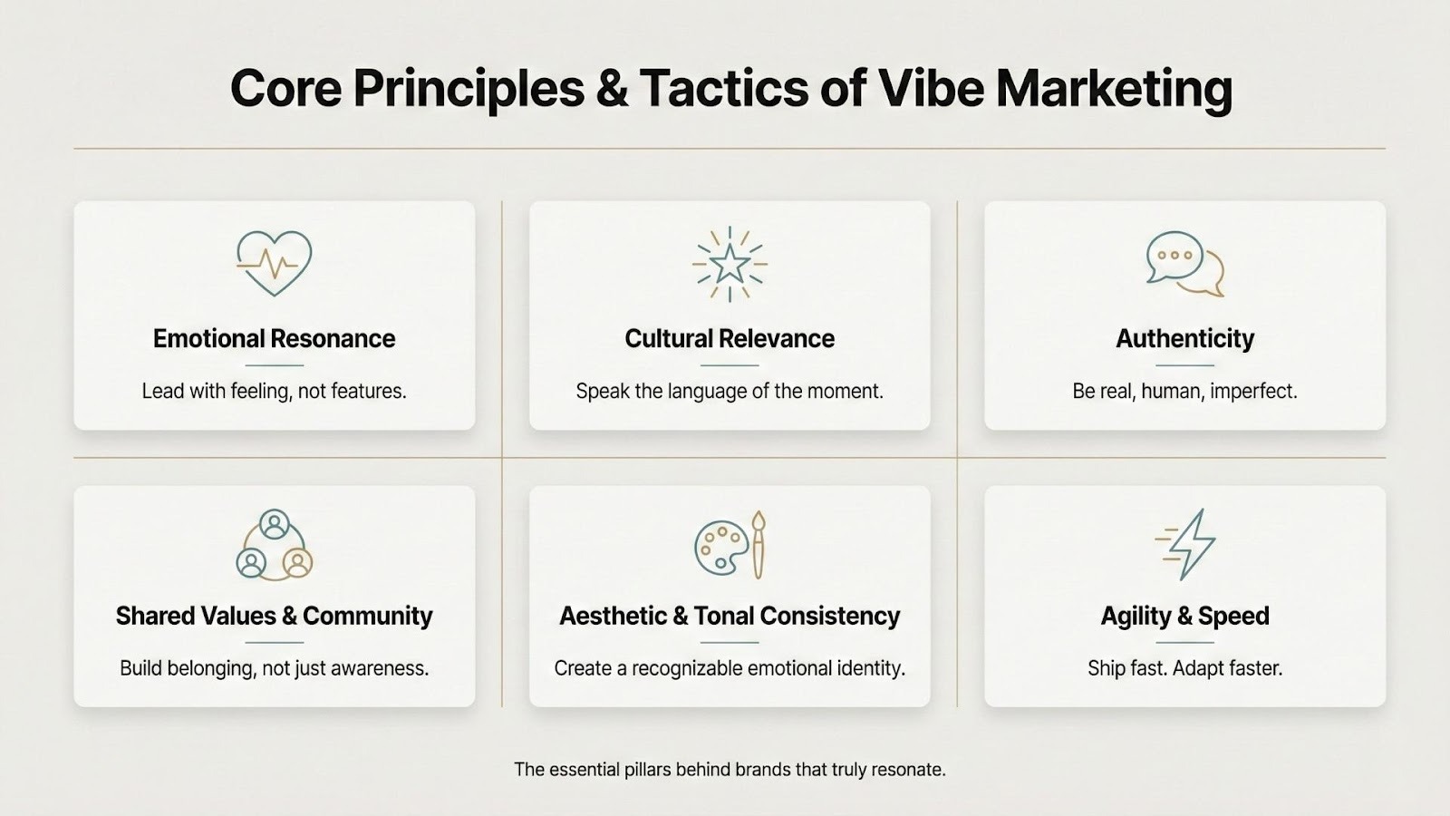 Vibe marketing isn’t a loose creative experiment. It’s a strategy with clear operating principles. These principles guide how a brand expresses itself, engages communities, and adapts to culture in real time. When I build or audit a vibe-first strategy, I look for the presence of these core pillars.