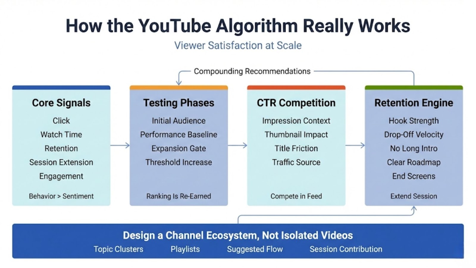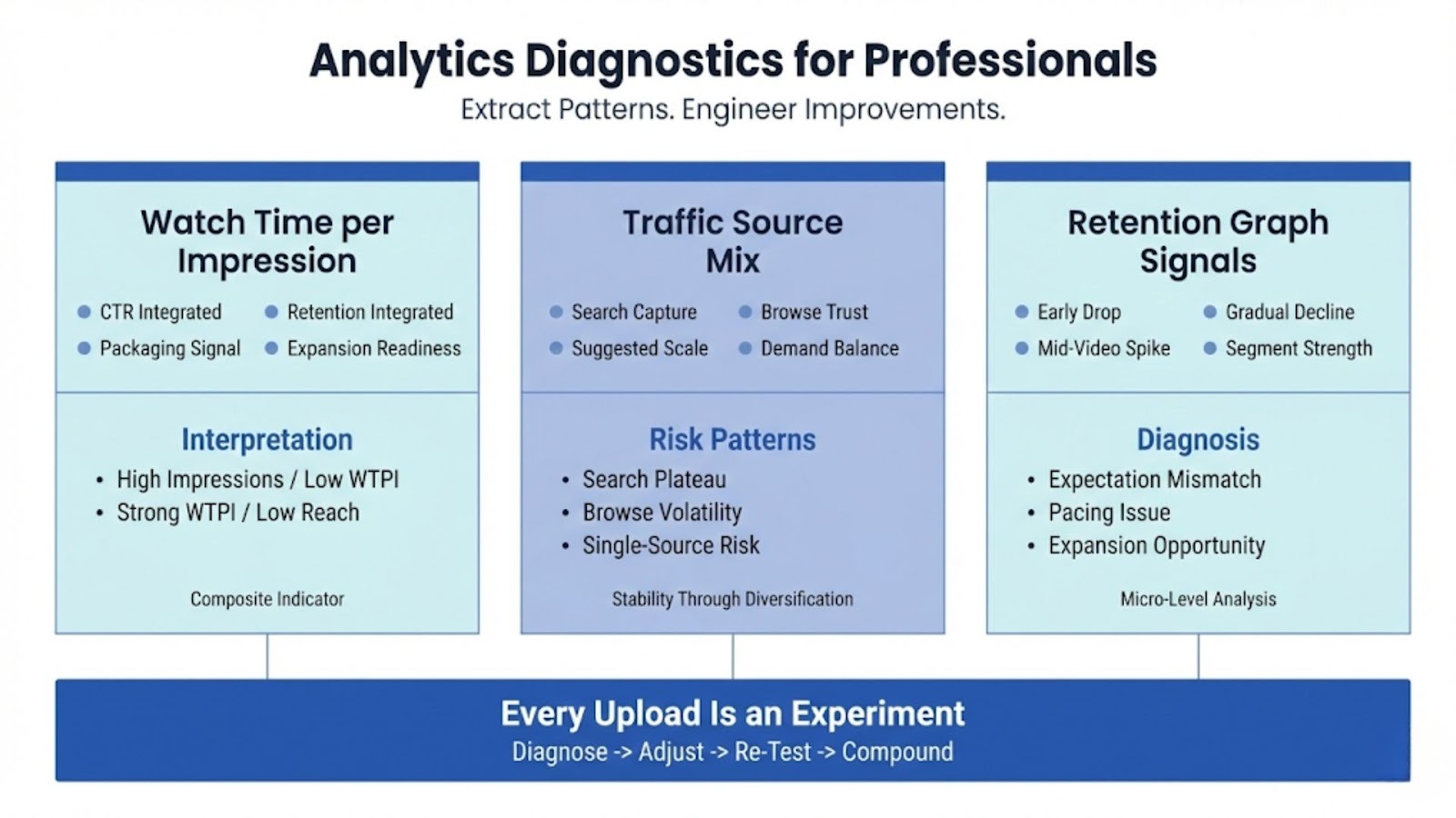 • Sustainable YouTube growth requires topic clustering, retention architecture, strategic packaging, and iterative optimization based on performance data.