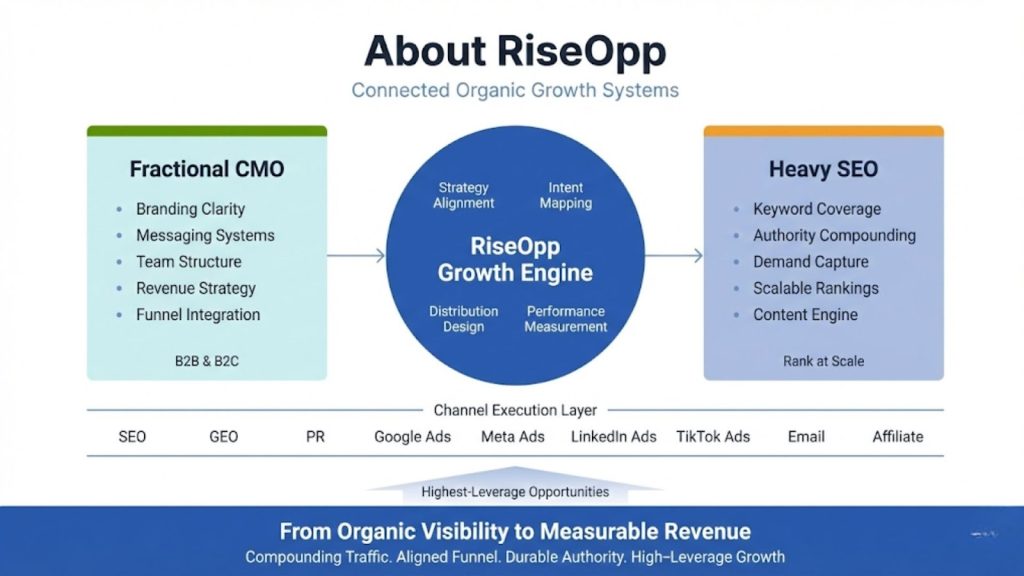 At RiseOpp, we help companies turn organic visibility into durable growth, even as discovery shifts in the age of AI. If you want your YouTube SEO efforts to compound, you need more than tactics. You need a connected system across content strategy, search intent, distribution, and measurement that supports the entire funnel.