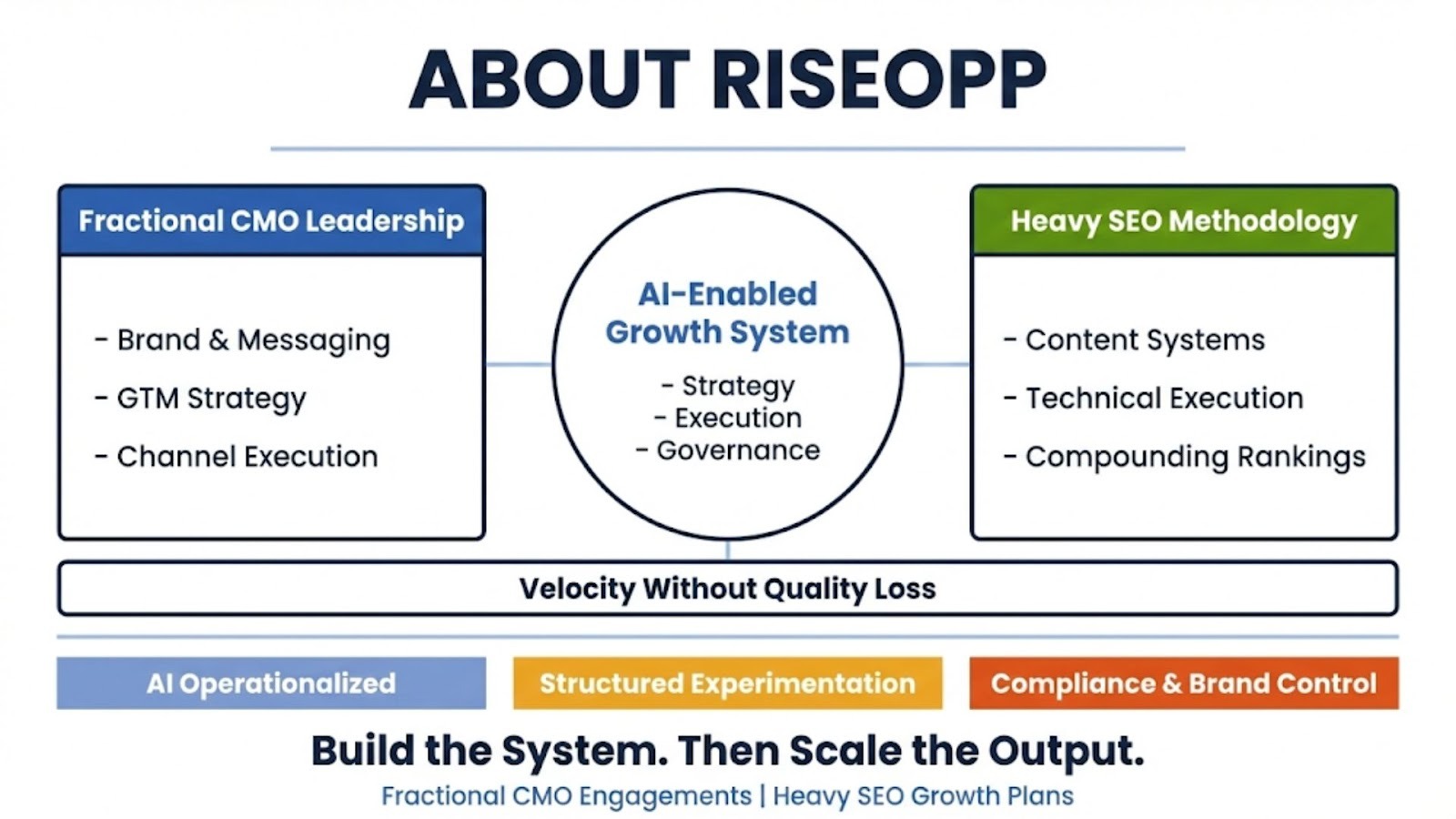If you’re ready to make AI a durable advantage, reach out to RiseOpp to discuss a fractional CMO engagement or an SEO growth plan built around Heavy SEO.