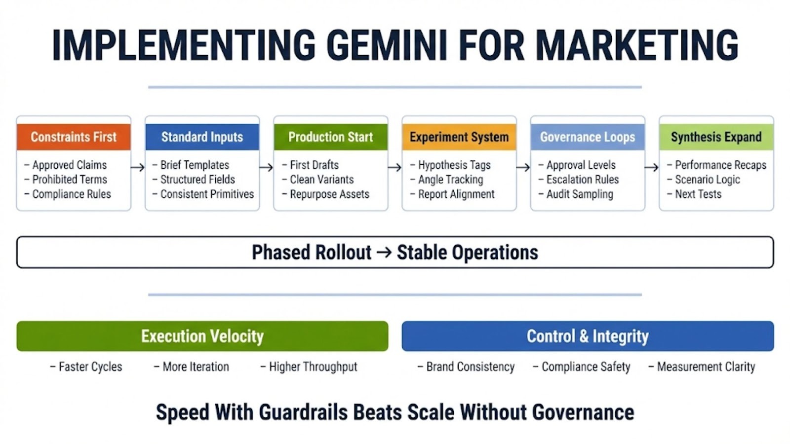 - Effective use of Gemini requires structured experimentation, strict claims governance, brand controls, and disciplined measurement frameworks.