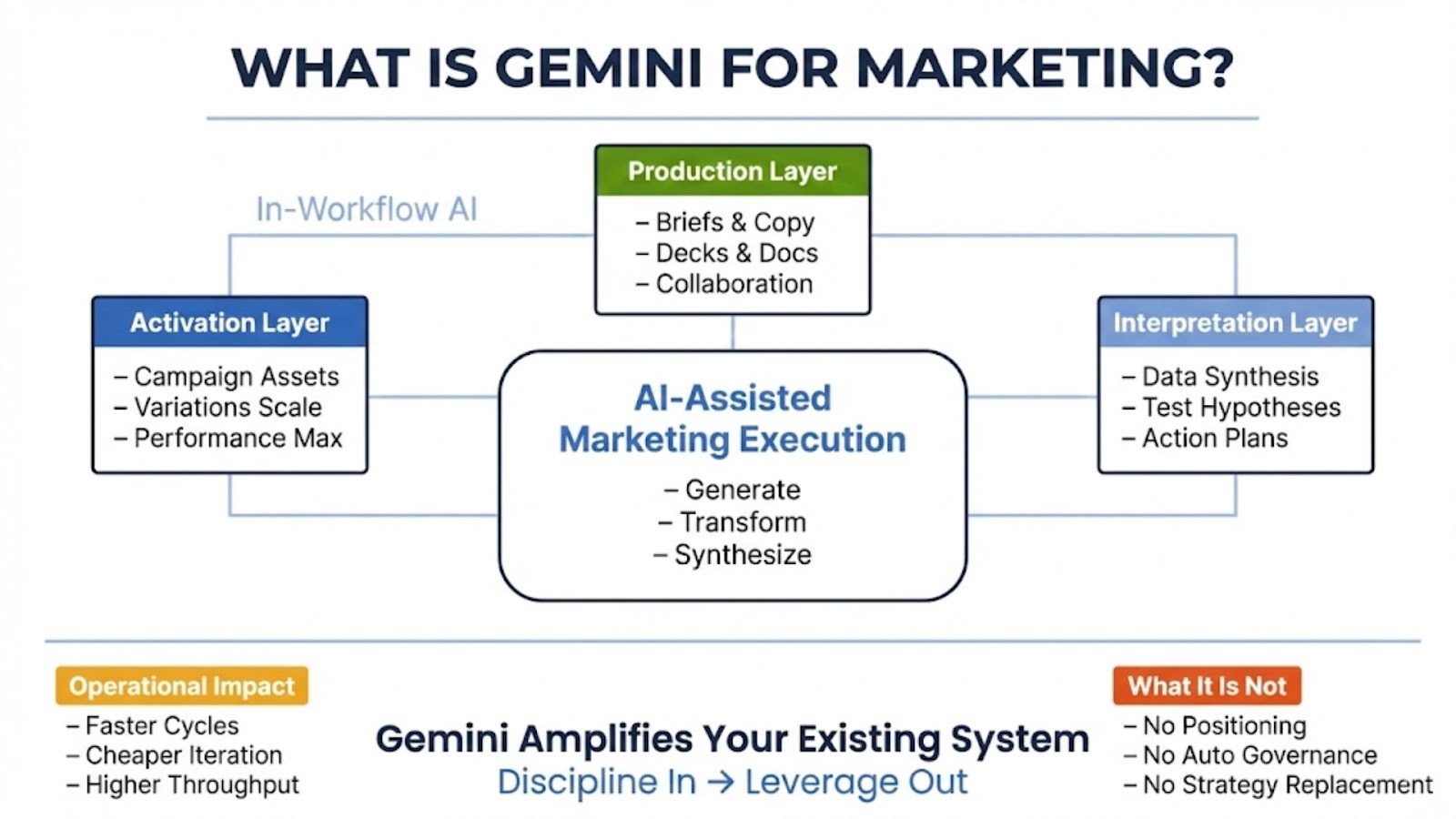 I define Gemini for Marketing as: AI-assisted marketing execution that uses Gemini models to generate, transform, and structure marketing work products, and to accelerate decisions through better synthesis of inputs. That includes content and creativity, but it also includes briefs, test plans, reporting narratives, and operational documents that normally consume high-skill time.