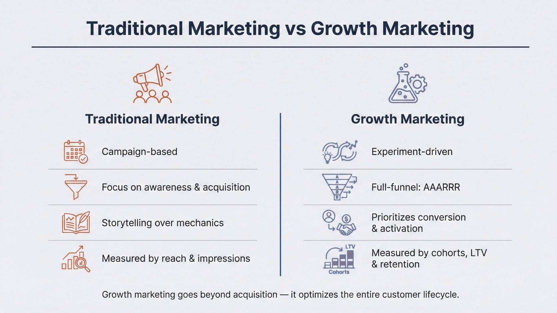 Where traditional marketing often ends at the point of acquisition, growth marketing digs deeper. It cares what happens after someone signs up. Do they activate? Will they come back? Do they tell their friends?