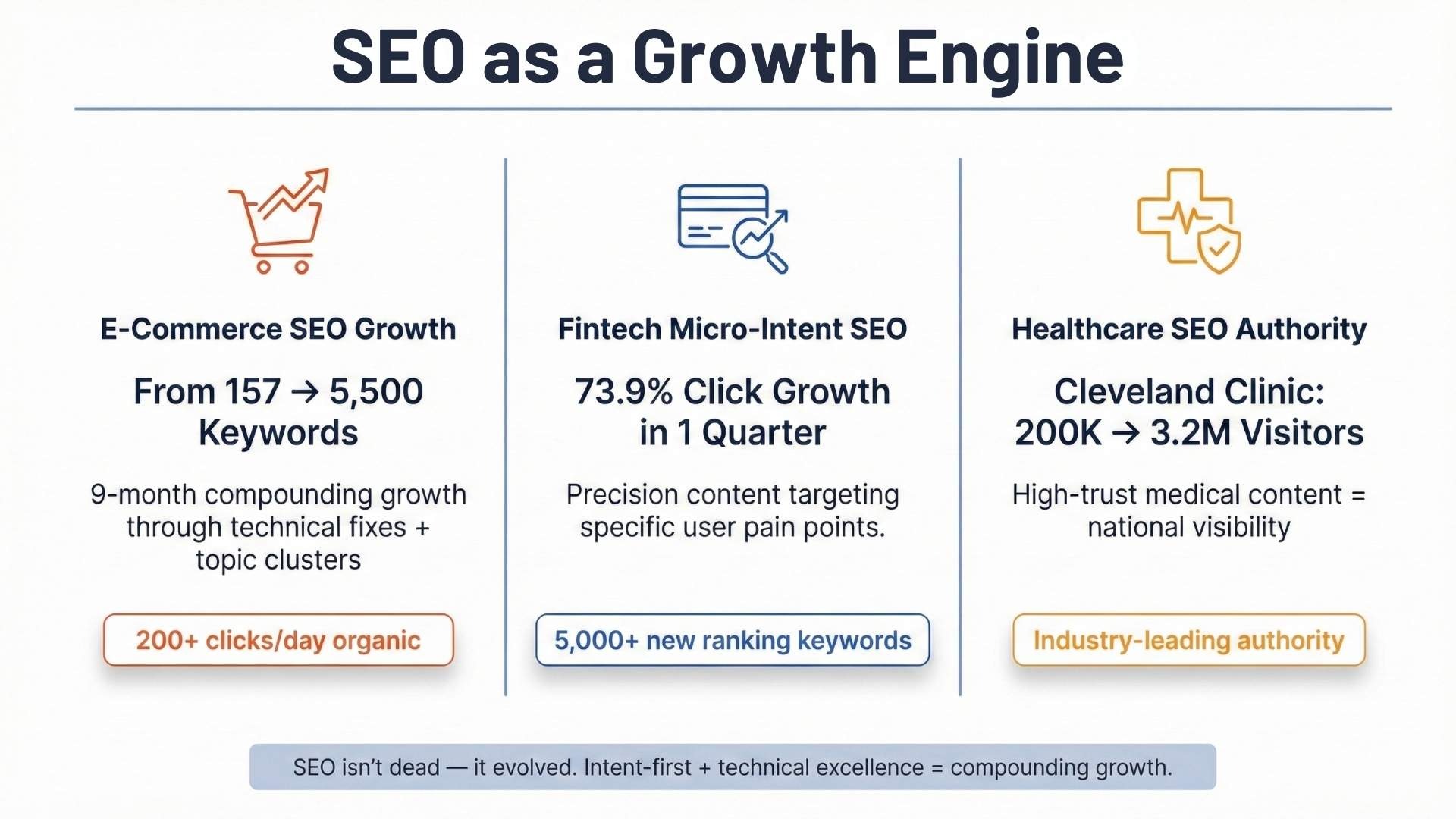 Even in industries that are traditionally slow-moving, like healthcare, SEO is a huge lever. Cleveland Clinic, for instance, built one of the most authoritative medical content libraries online. They didn’t just rank well; they became the go-to health source. Their blog traffic jumped from 200,000 to 3.2 million monthly visitors in under two years.