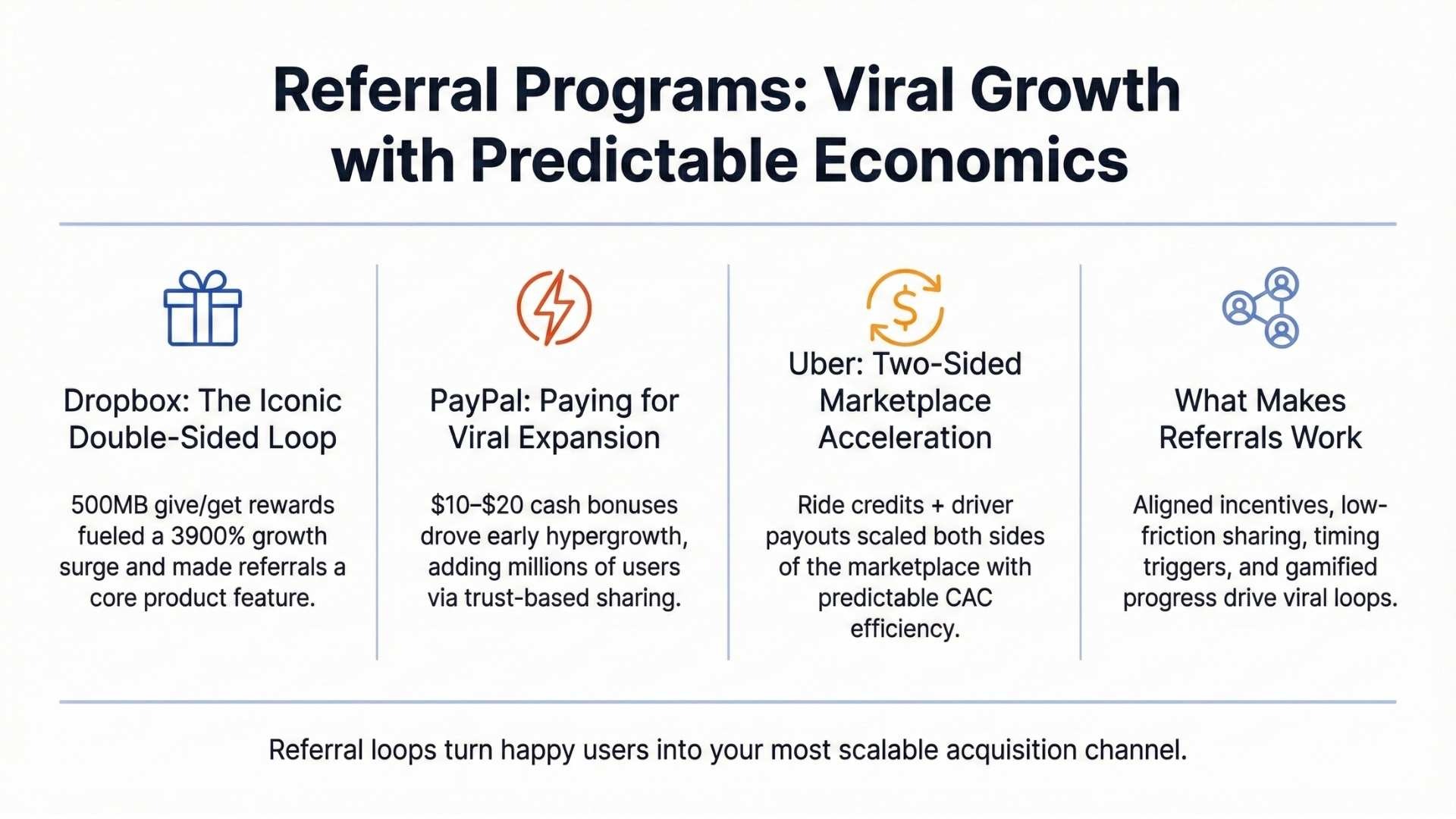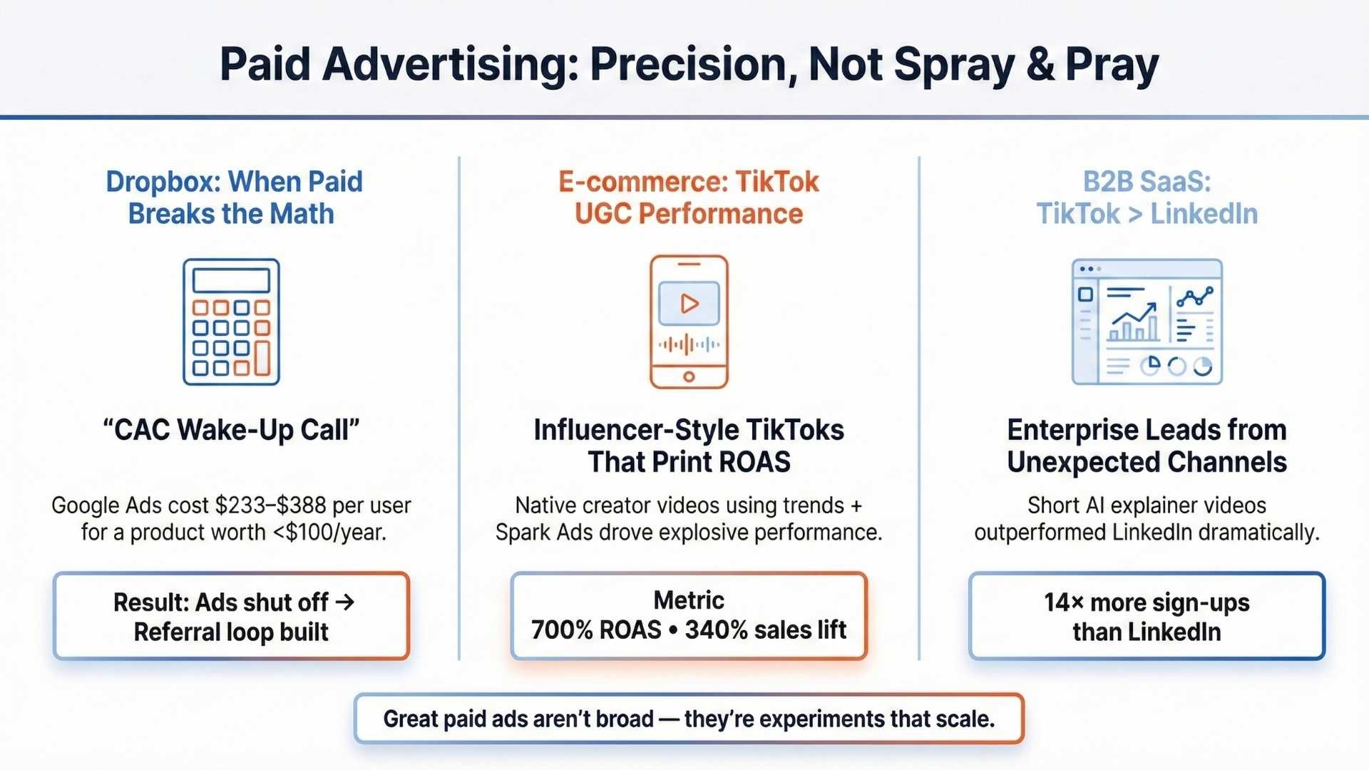 They shut it down. That failed experiment is what pushed them to build their legendary referral loop instead (more on that later). But it also taught their growth team to treat paid acquisition as a performance channel, not a hope-and-pray channel.