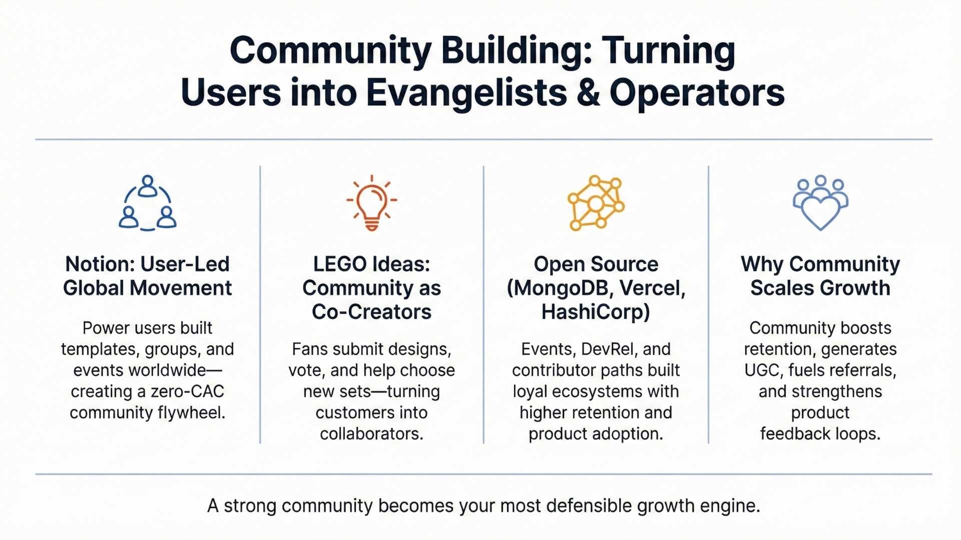Community should feed back into your growth loop: support → content → referrals → feedback → retention. - Invest in Ops