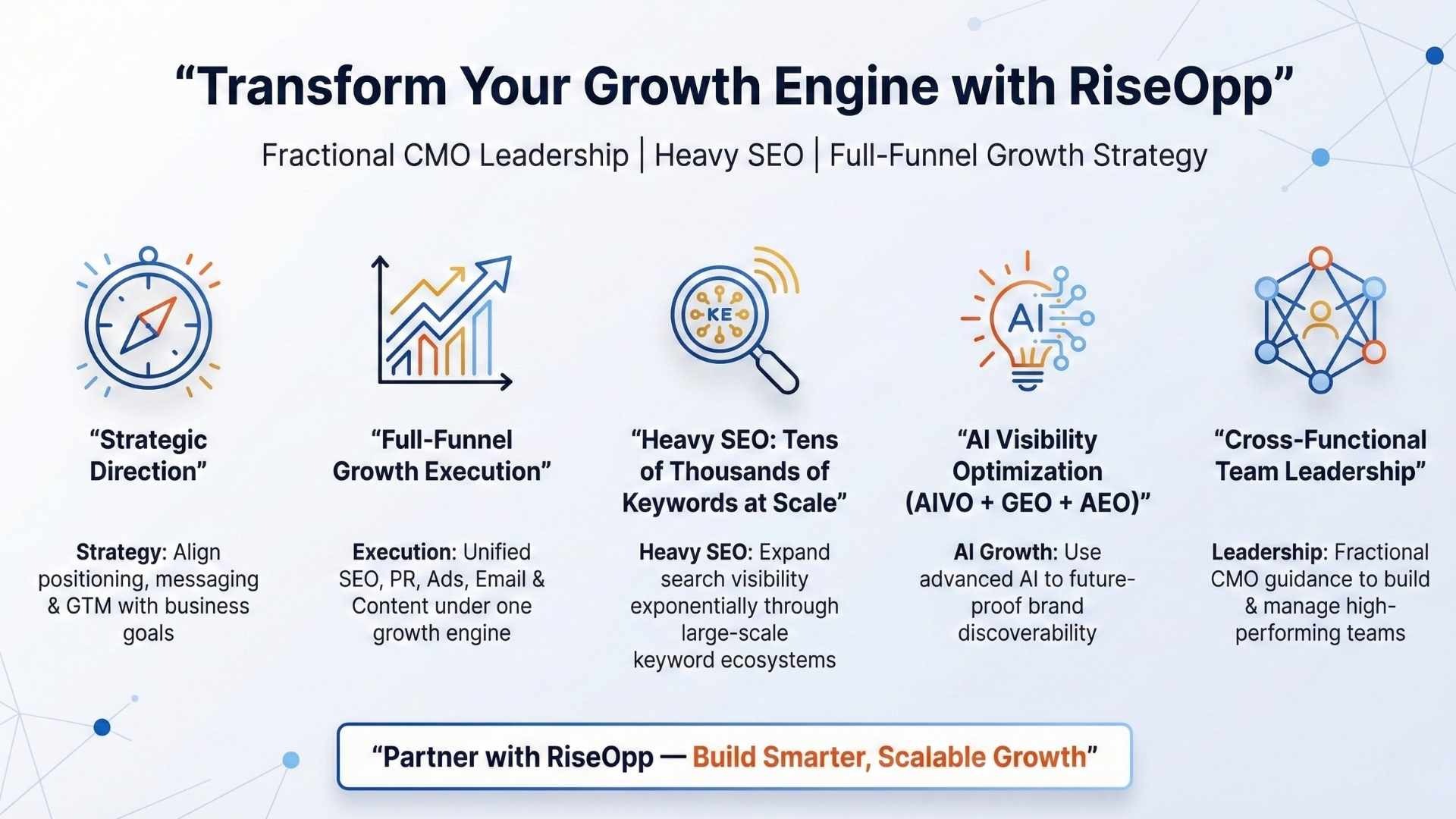 As a Fractional CMO and GEO & SEO agency, RiseOpp works with B2B and B2C companies that need senior-level ownership of growth without adding a full-time C-suite headcount. Through its comprehensive Fractional CMO services, RiseOpp helps marketing leaders: