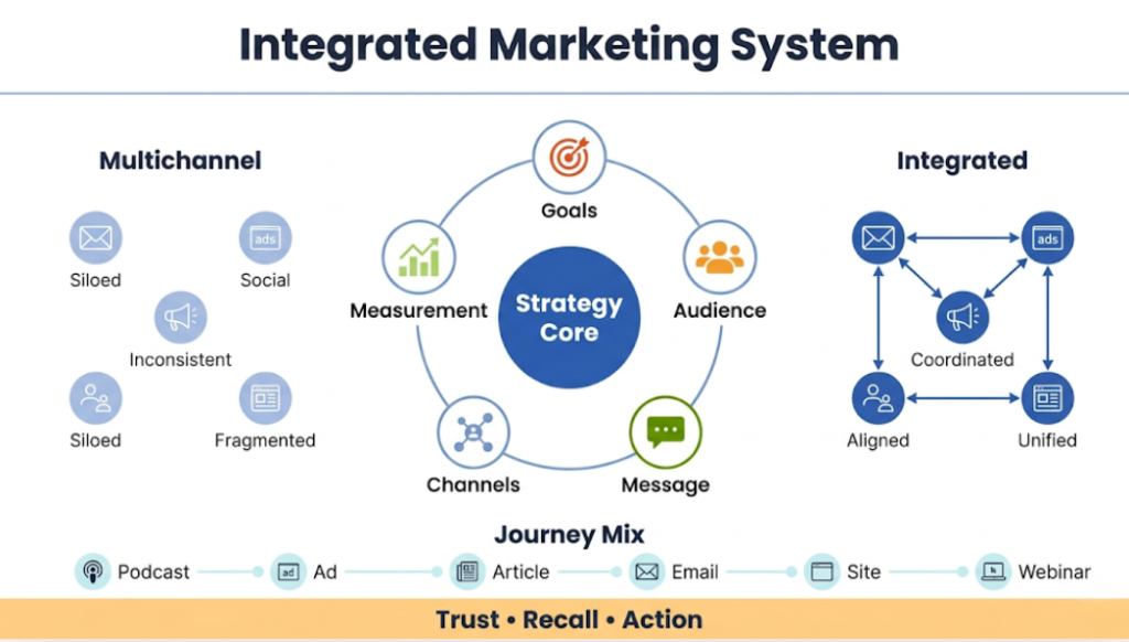 Integrated marketing recognizes that reality. It does not ask, “Which single channel drove the result?” It asks, “How do I make the entire system work together to influence memory, trust, consideration, and action?”