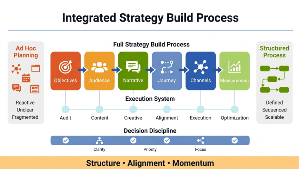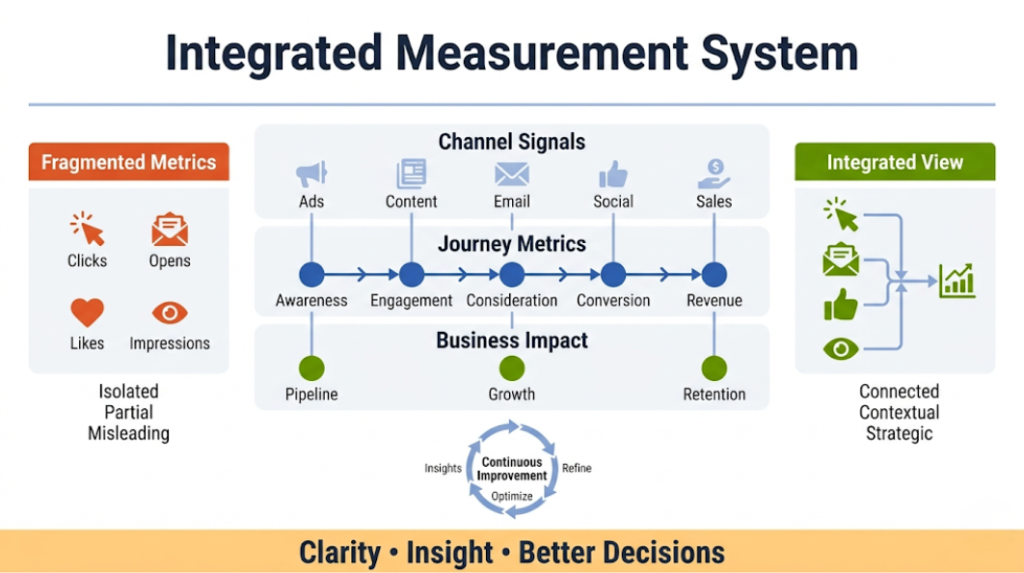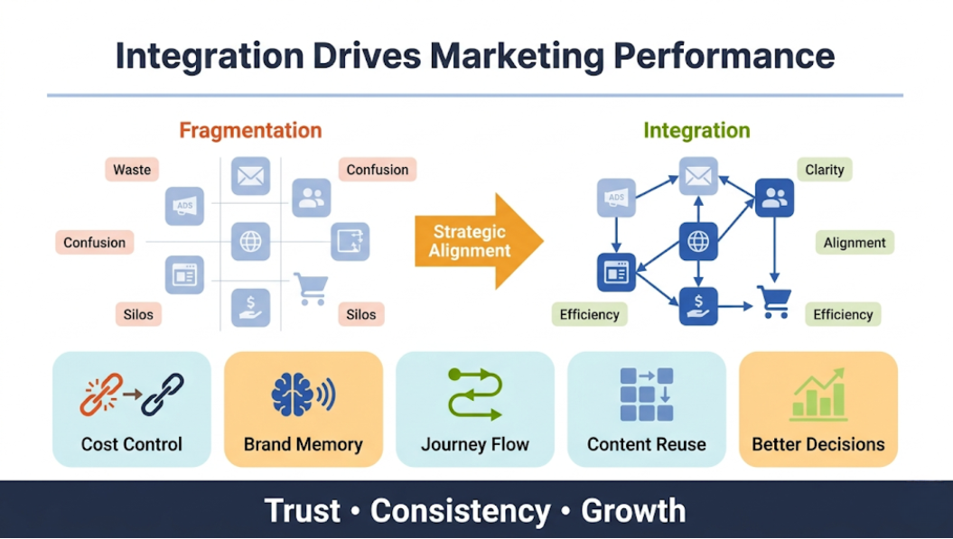 Fragmentation weakens brand memory. It slows down the customer journey. It lowers conversion efficiency. It confuses internal teams. It creates measurement problems because nobody can tell which activities worked together and which ones pulled in opposite directions. It also makes optimization harder because the business evaluates isolated tactics rather than the system as a whole.