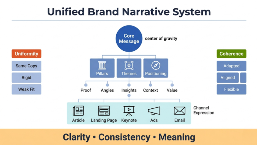 Every integrated marketing strategy needs a center of gravity. I usually call this the core message or strategic narrative. It is the organizing idea that keeps the whole system aligned.
