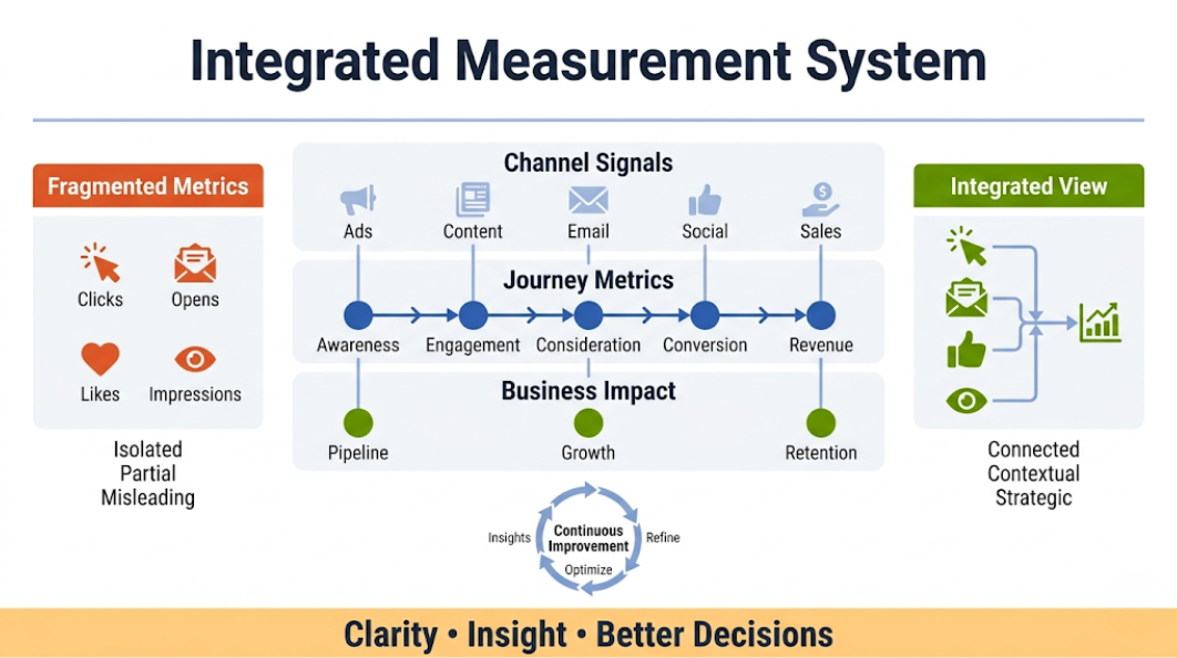 When channels operate separately, measurement becomes misleading. Each team optimizes against its own local metrics. Paid media looks at click-through rate and cost per lead. Social looks at reach and engagement. Email looks at opens and clicks. Content looks at traffic and time on page. Sales looks at pipeline. Nobody looks at how the parts influenced one another.