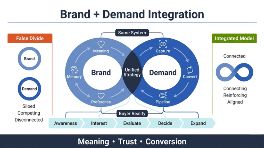 Integrated marketing strategy should be one of the clearest answers to this divide because it gives brand and demand a shared operating logic. Brand creates meaning, memory, familiarity, and preference, which must ultimately align with broader inbound and outbound marketing dynamics. Demand capture and demand creation convert that accumulated meaning into action. They are not enemies. They are different functions inside the same commercial system.