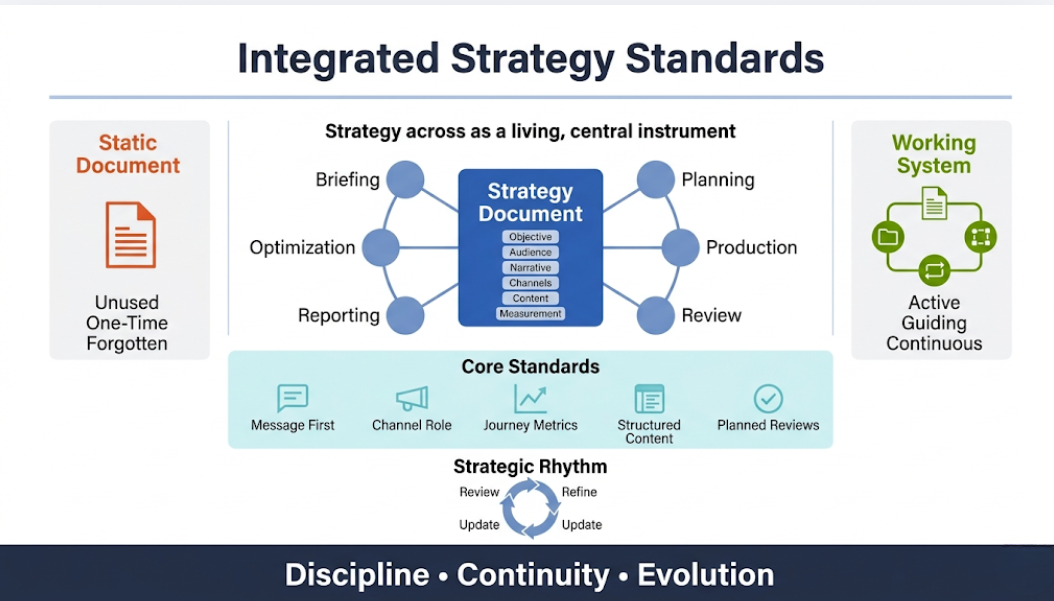 I want teams returning to it during briefing, production, campaign planning, review, reporting, and optimization. It should shape real decisions. If it does not, it is not functioning as a strategy. It is functioning as presentation material.