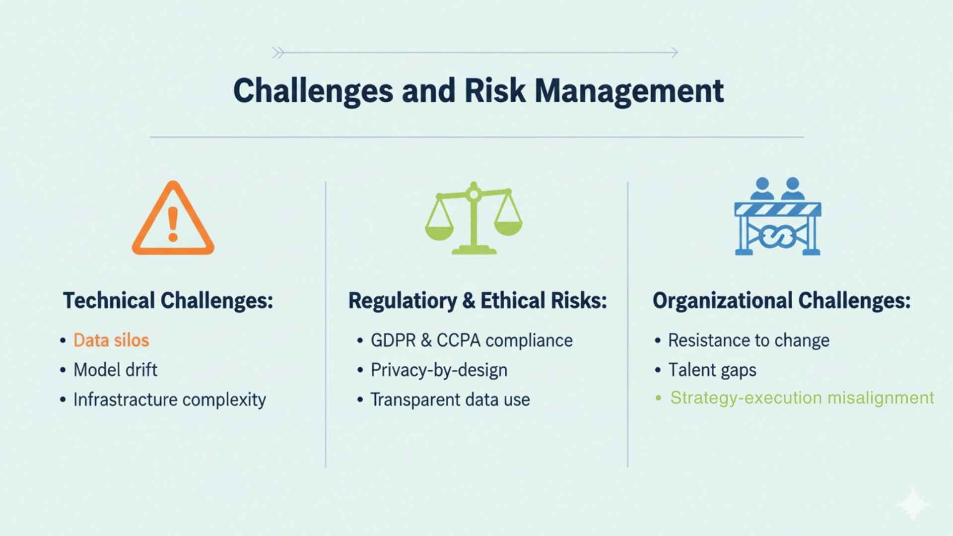 Common challenges include fragmented data silos, model drift affecting predictive accuracy, lack of team alignment across departments, and compliance issues related to privacy regulations. Addressing these early through planning and governance improves adoption success.