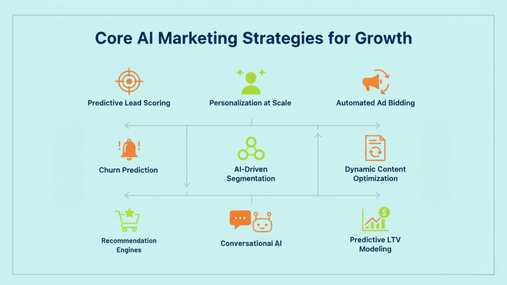 A successful AI marketing strategy combines data-driven insights with automation to drive measurable results across the customer journey. While AI technologies provide the foundation, the real impact comes from applying them to specific, proven strategies that enhance acquisition, engagement, and retention.