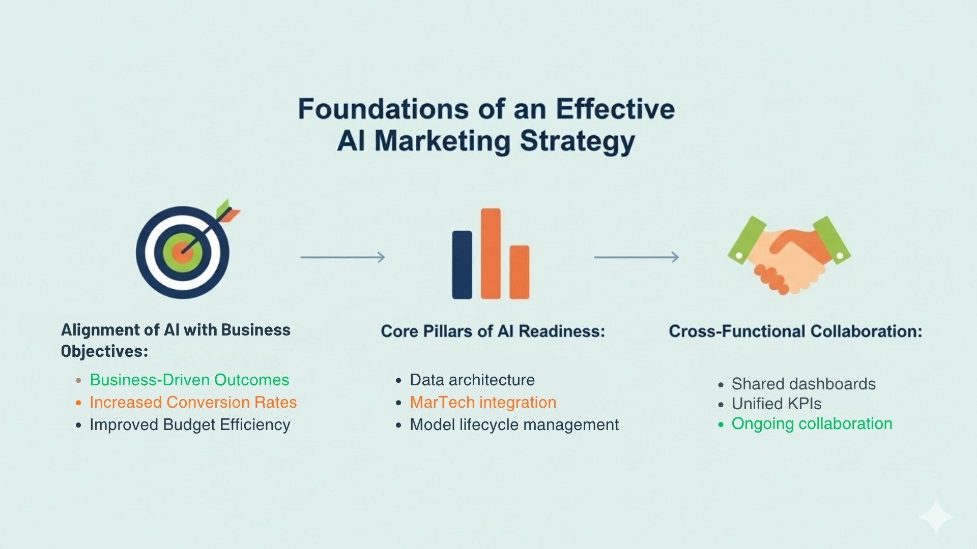 A robust AI-driven marketing framework rests on three critical pillars: data architecture, MarTech integration, and model lifecycle management.