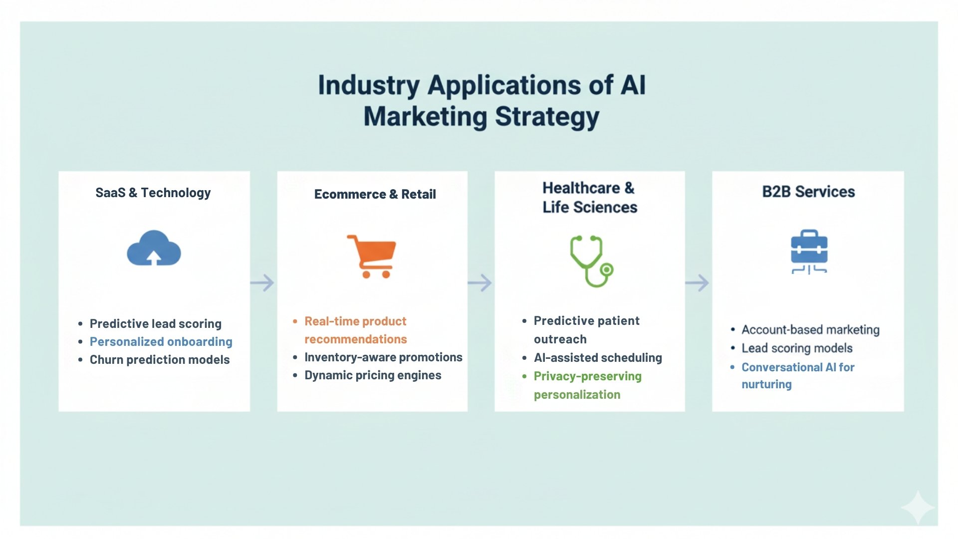 Healthcare organizations face strict privacy regulations and diverse patient needs. AI marketing strategy in this sector focuses on compliant, data-driven engagement: