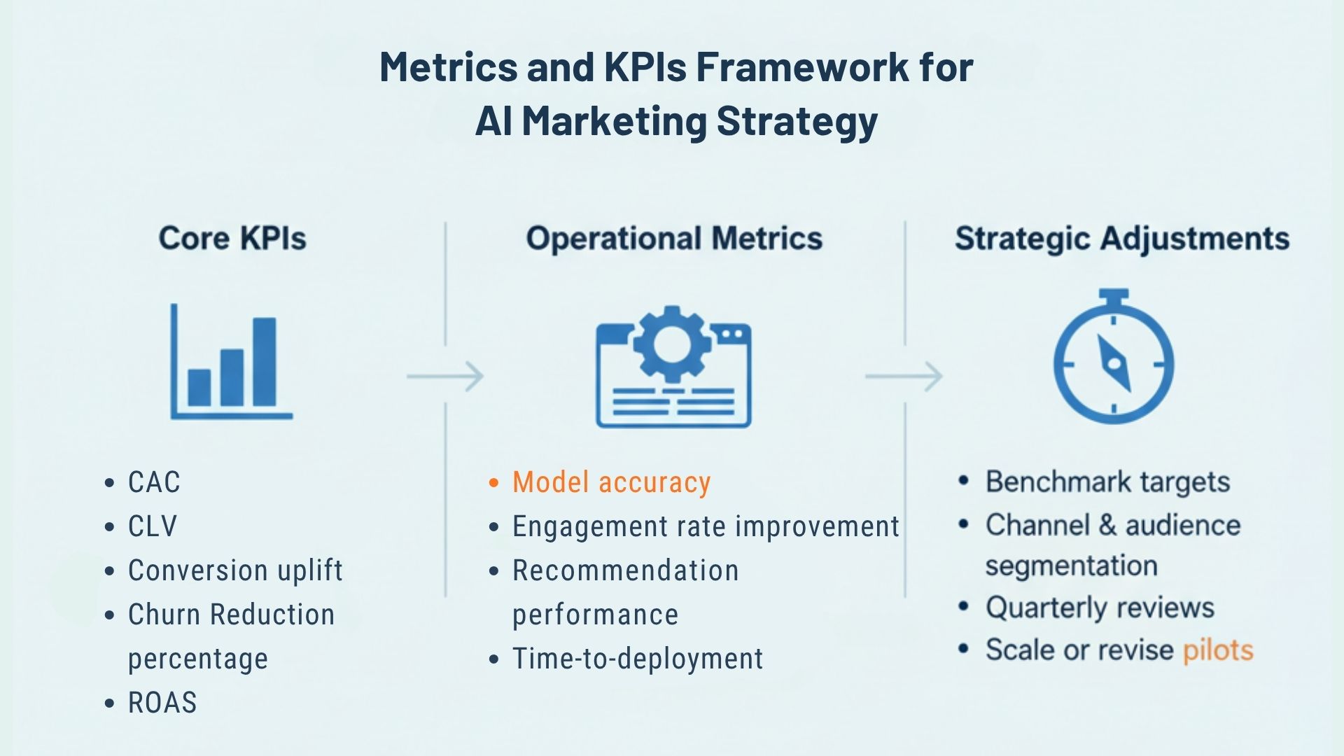 Track critical metrics such as conversion uplift, churn reduction, and ROI alongside operational indicators like model accuracy and response times. Regular reviews help detect drift or underperformance early.