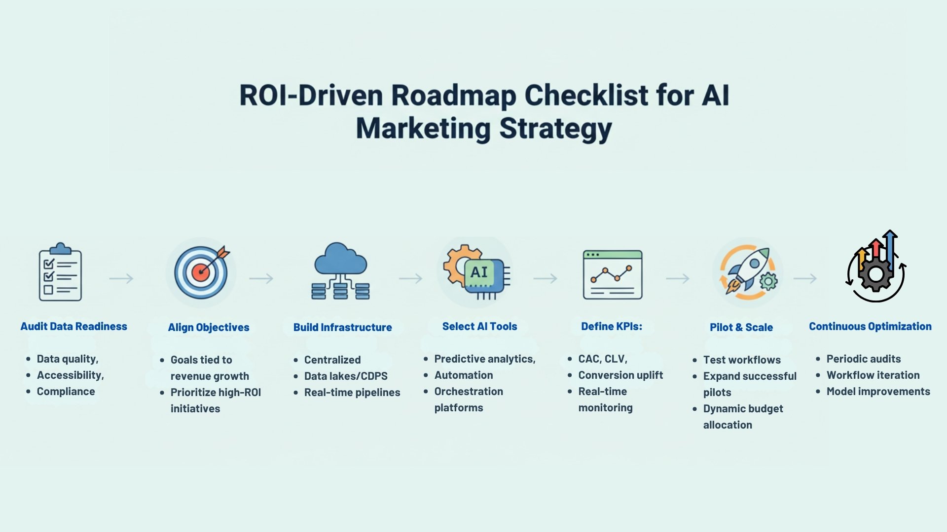 Begin with a data readiness assessment, align objectives with revenue-driven outcomes, and prioritize initiatives with measurable ROI potential. Pilot small-scale projects first, refine workflows based on insights, and then scale high-performing campaigns.