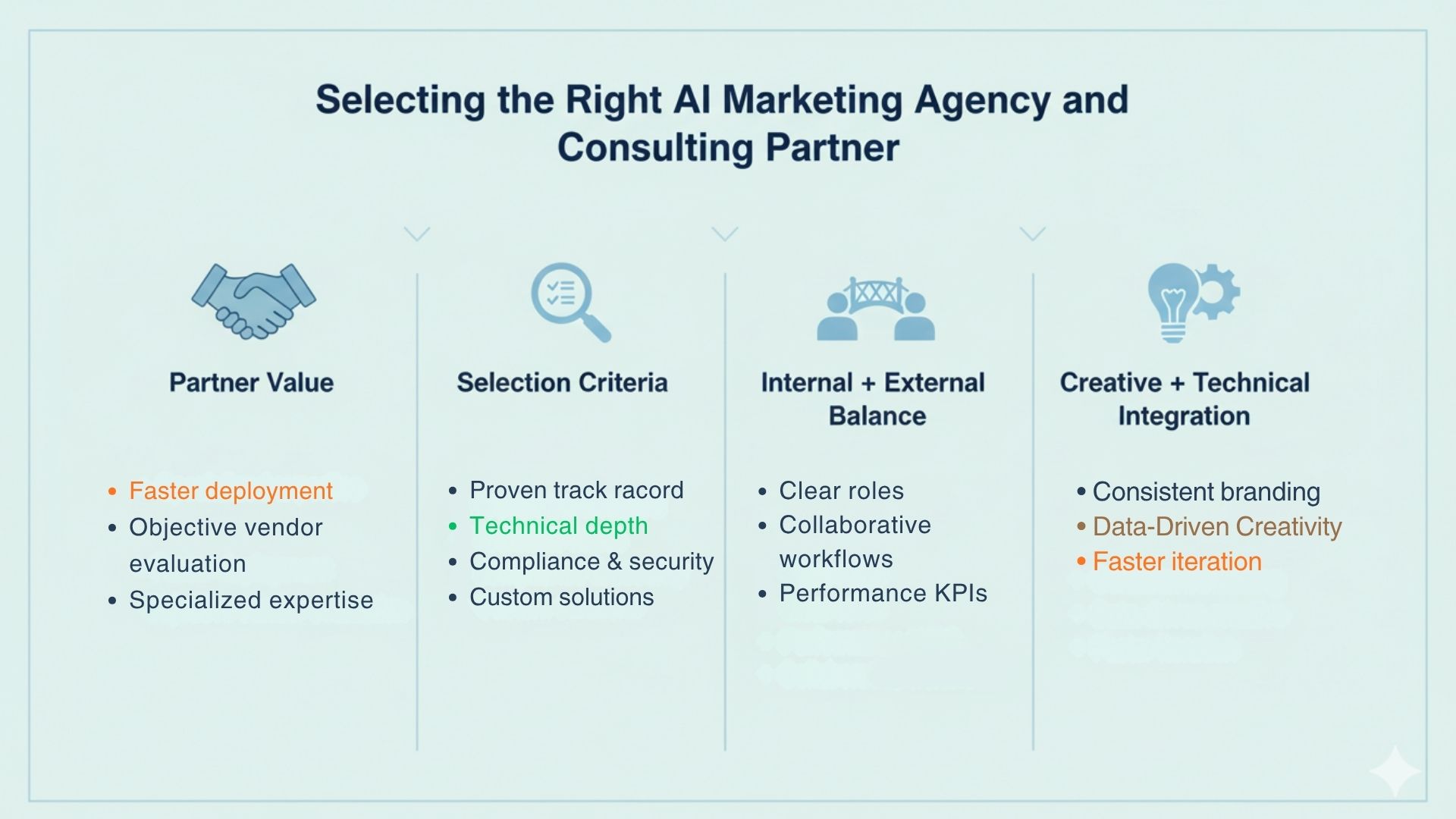 - Criteria for AI marketing agency selection and considerations for consulting partnerships
