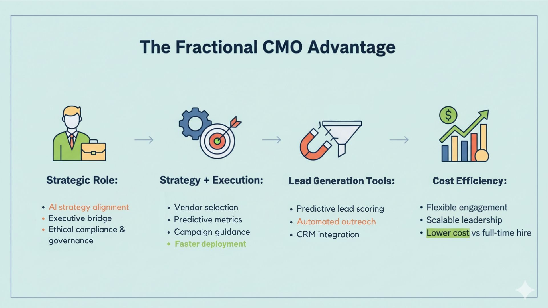 - Strategic advantages of an AI fractional CMO and tools for fractional CMO lead generation
