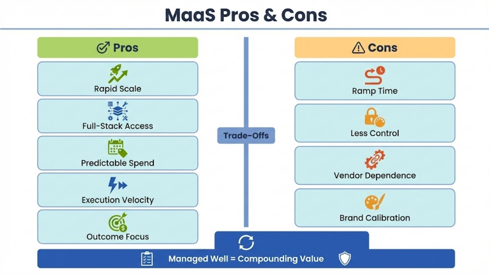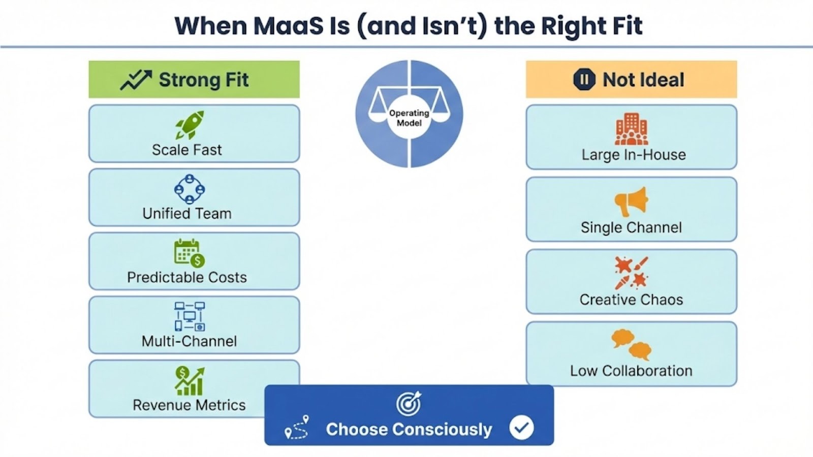 - MaaS is most effective for growth-stage companies that need speed, breadth, and scalability without building or managing a full in-house marketing team.
