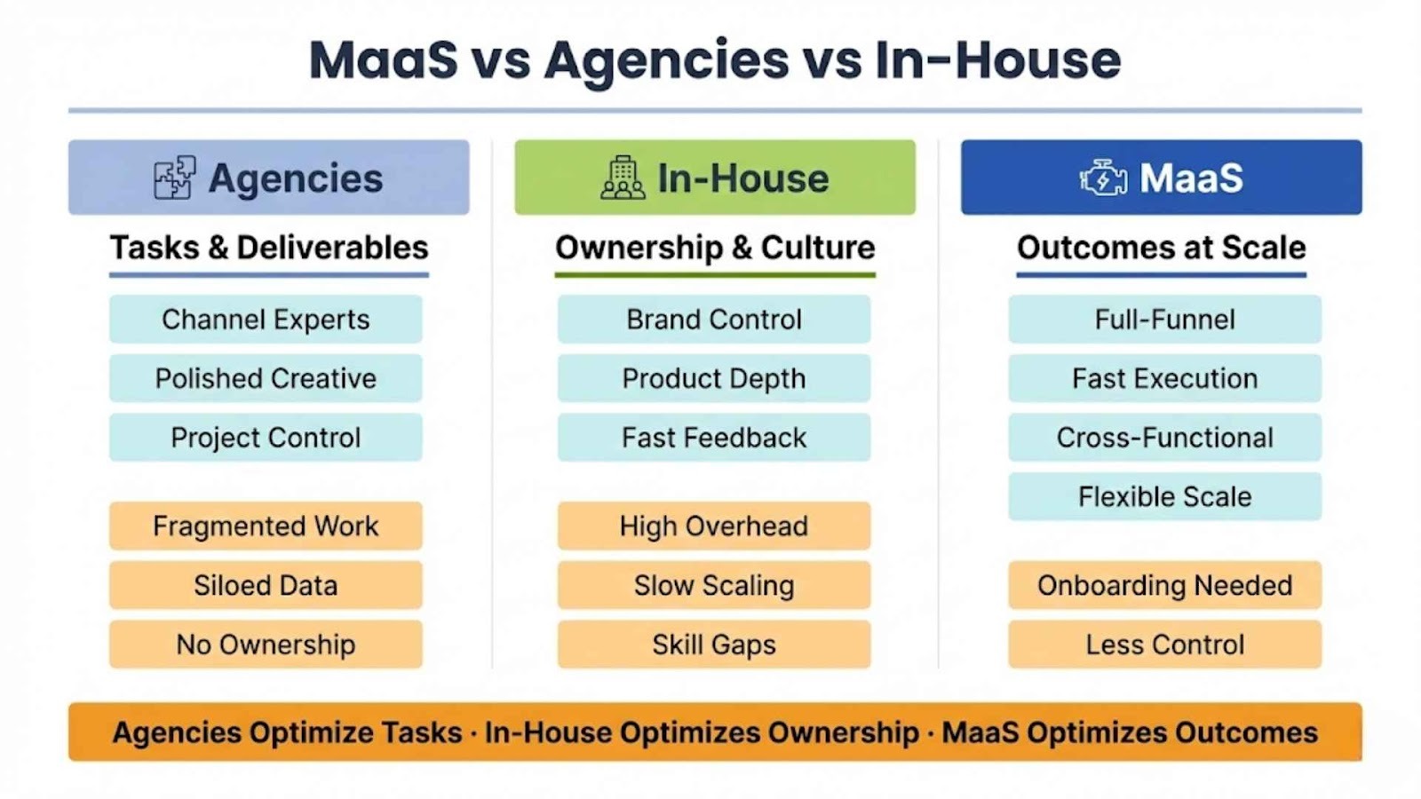 - MaaS integrates strategy, campaigns, technology, analytics, and operations into a single, accountable system aligned with revenue, pipeline, and CAC outcomes.