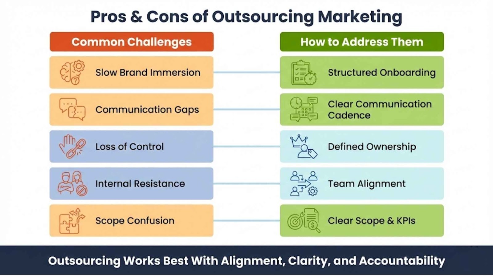 - Outsourcing risks include weak brand immersion, collaboration delays, and scope creep; clear KPIs, reporting cadence, and contracts reduce them.