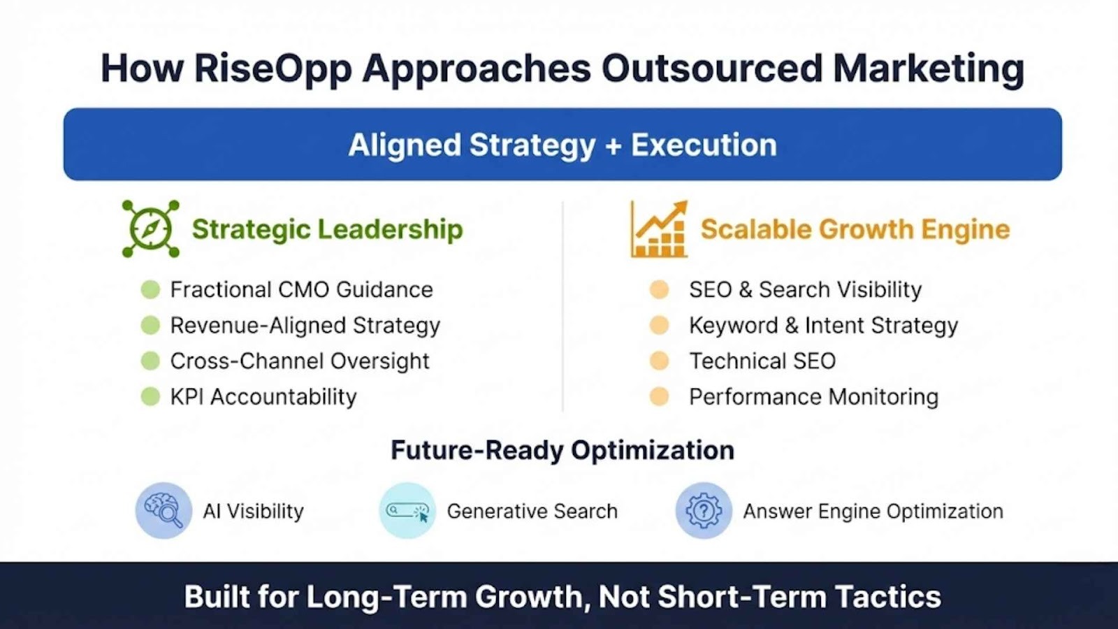 At RiseOpp, we approach outsourced marketing as a strategic growth function. We combine senior-level leadership, proven execution frameworks, and AI-powered systems to help companies scale faster, without increasing complexity or headcount.