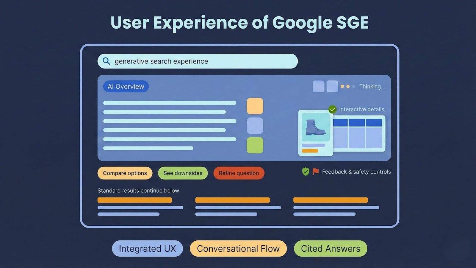 When I first used SGE, I noticed how deliberately it avoids looking like a chatbot. Instead of pulling users into a separate AI mode, it integrates seamlessly into the Google Search results page. This was a smart choice.