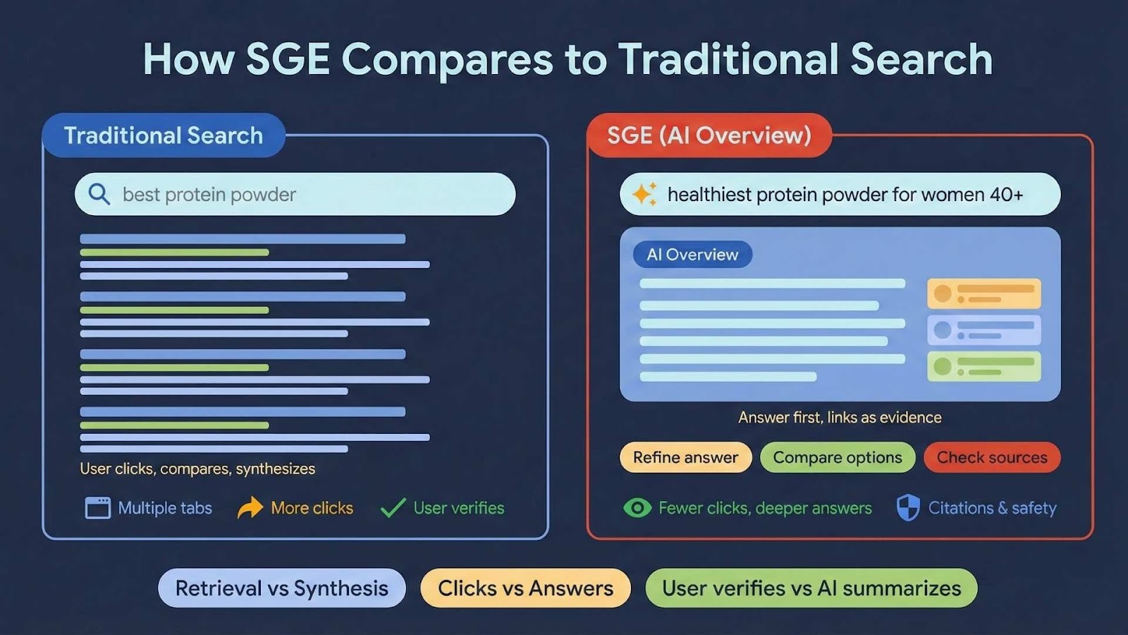 The questions people ask are evolving, too. Instead of “best protein powders,” users now search for “what are the healthiest protein powders for women over 40 with iron deficiency?” SGE is built to handle that complexity, and it’s reshaping user expectations accordingly.