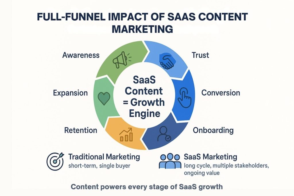 - SaaS content marketing drives growth across acquisition, retention, and expansion by integrating education, trust, and product experience.