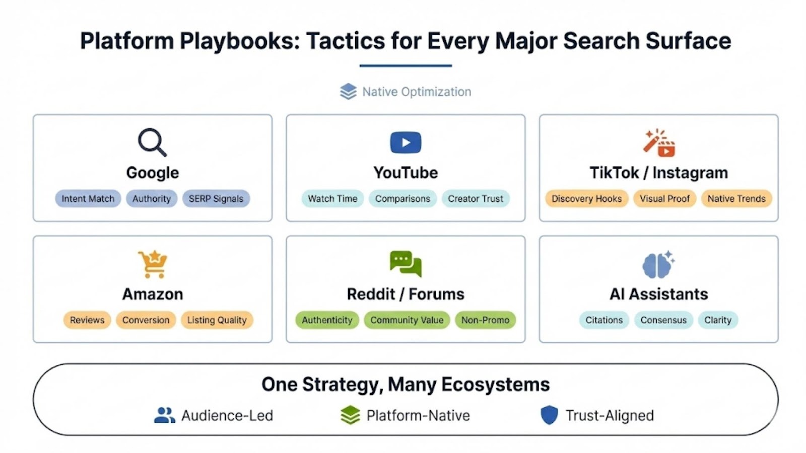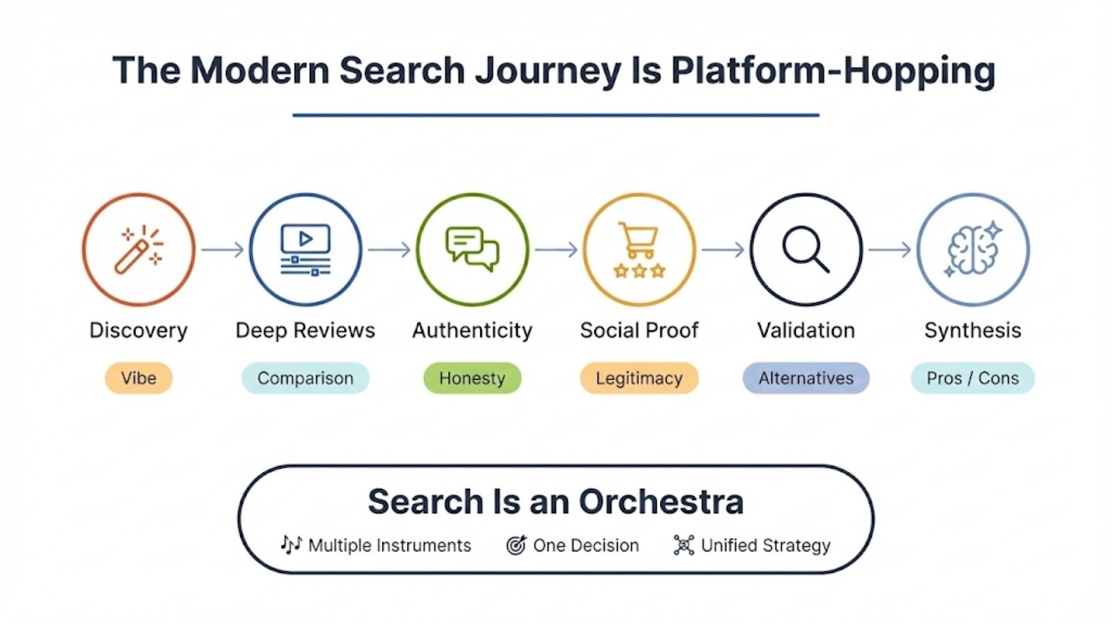 People don’t “use Google.” They look for answers. Sometimes that happens on Google. Other times it happens on TikTok, Reddit, Amazon, YouTube, or inside an AI assistant. The platform changes, the intent does not. - Trust is assembled across multiple touchpoints