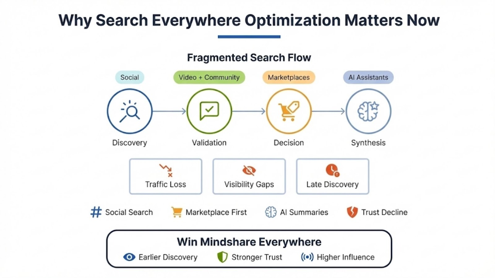 - Search Everywhere Optimization addresses fragmented search behavior where discovery, validation, and decisions occur on different platforms rather than a single search engine.