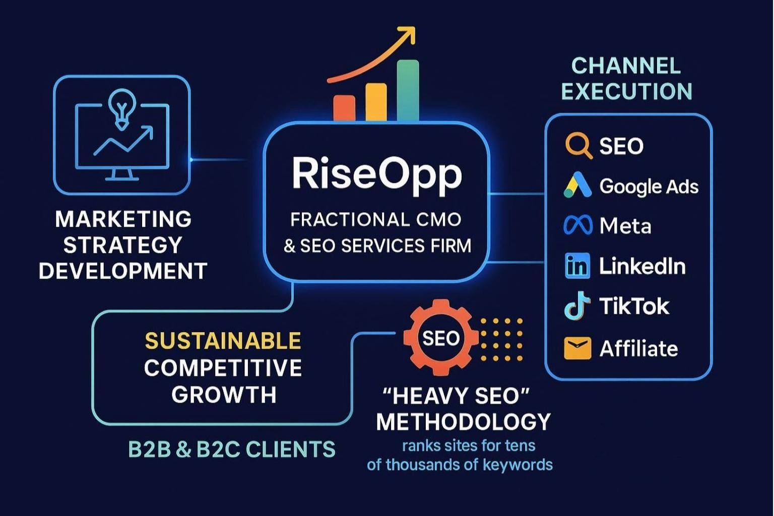 At RiseOpp, we don’t just talk about strategic marketing; we live it. Everything discussed in this article reflects the real-world approach we take as a Fractional CMO and SEO partner to our clients. Whether we’re designing a full-funnel go-to-market strategy, repositioning a brand in a competitive category, or building a demand engine across paid and organic channels, we anchor every move in strategic insight.