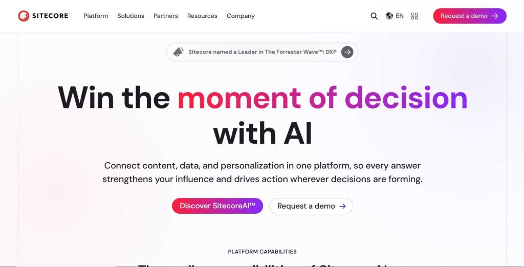 The platform stands out for its innovation, particularly through its composable architecture and integration of AI-driven personalization tools. Sitecore’s solutions, such as XM Cloud and Content Hub, demonstrate a forward-thinking approach that allows businesses to scale efficiently while maintaining agility. Its robust portfolio includes global brands across industries, showcasing its ability to handle complex digital ecosystems and deliver consistent, high-quality experiences. This is reinforced by strong customer satisfaction, driven by reliable performance, extensive partner support, and a well-developed ecosystem.