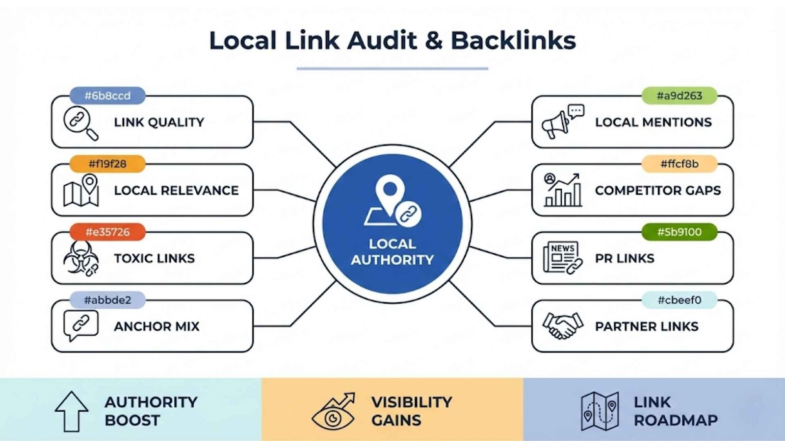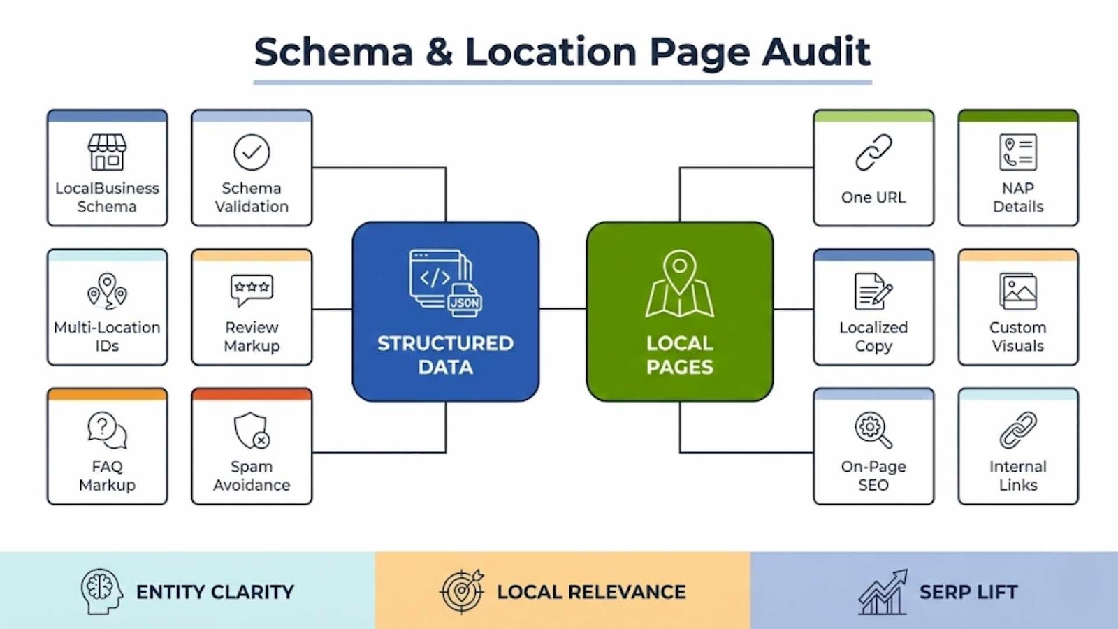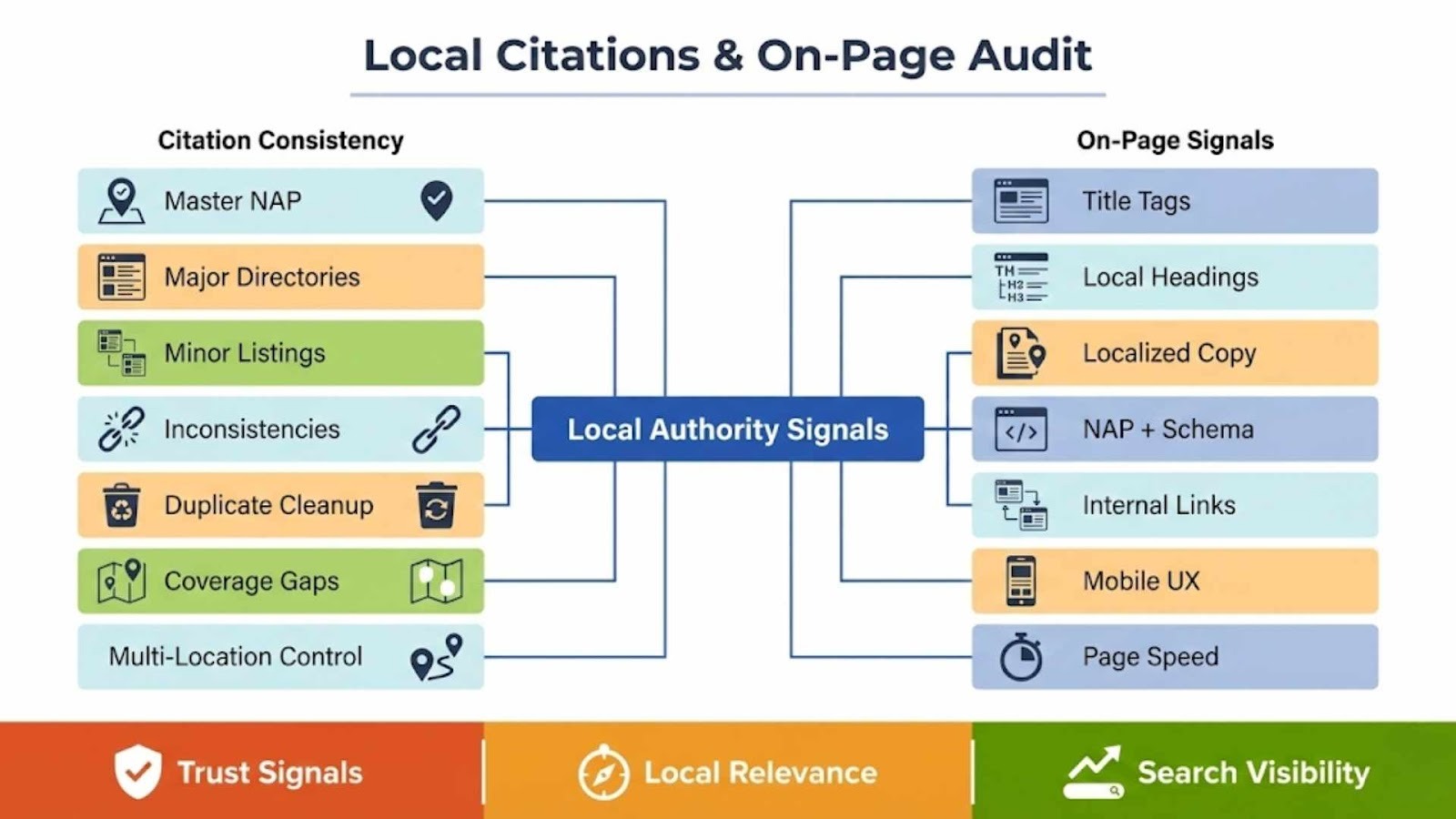 - A local SEO audit evaluates Google Business Profile, citations, on-page SEO, reviews, links, technical health, schema, and location pages to diagnose ranking issues.