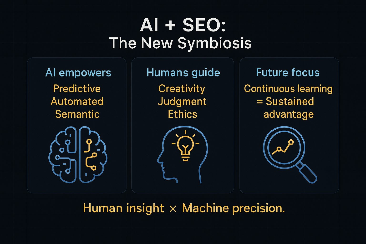 The future of SEO with AI depends on collaboration between human insight and machine intelligence. As the line between SEO and AI fades, skilled practitioners will integrate AI as an extension of their optimization intelligence, combining human understanding with algorithmic precision to shape search mastery’s next era.
