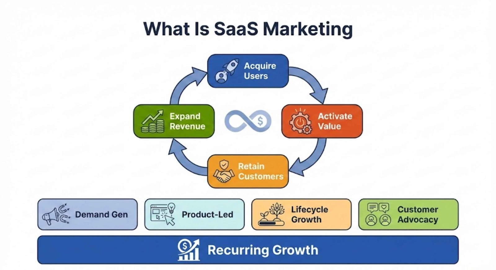 SaaS marketing refers to the strategies and tactics used to promote, sell, and grow software-as-a-service products. It focuses on acquiring users, activating them inside the product, retaining them over time, and expanding revenue through upgrades, add-ons, and renewals.